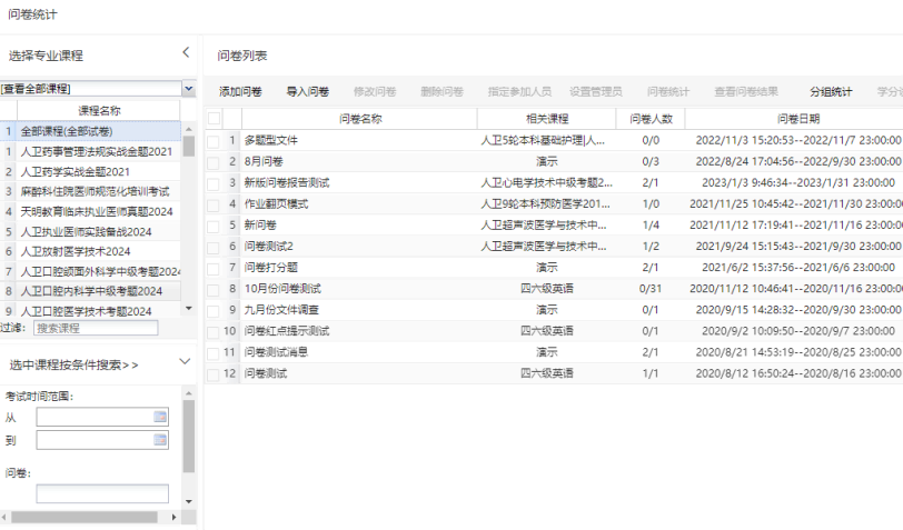 从菜单中选择“问卷管理”。选择课程,可以看到课程的问卷列表。