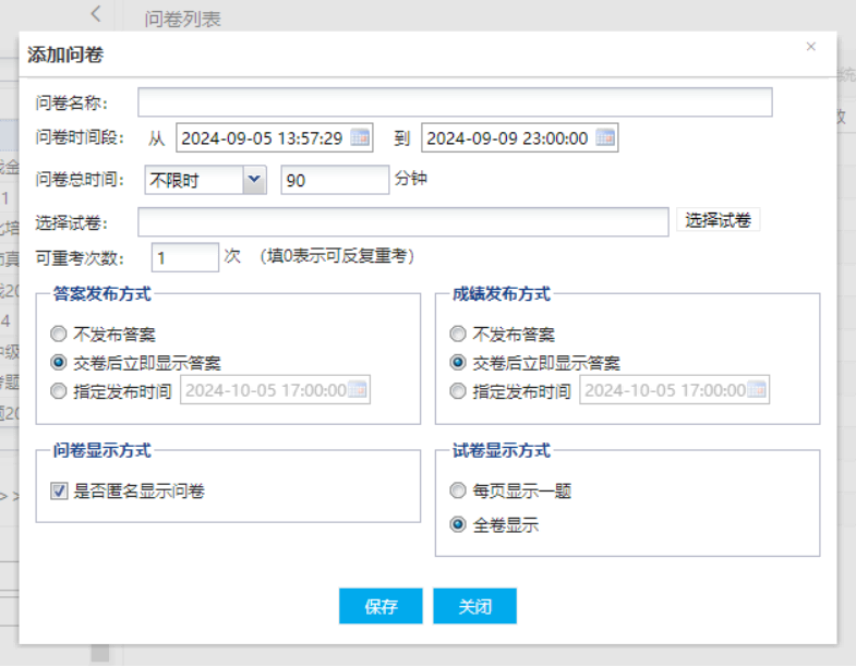 点击添加问卷按钮,可以选择一份已经创建的试卷,将试卷当做问卷来作答。