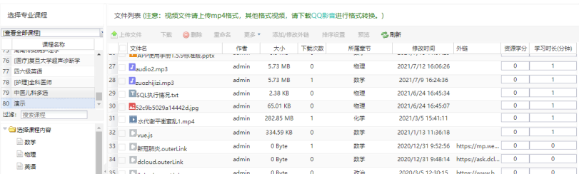 上传文件:选中课程下某章节,然后点击文件上传。
