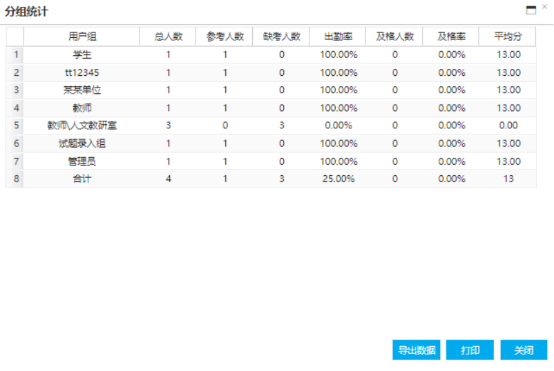 分组统计:统计各个部门学员问卷完成人数,比例等。